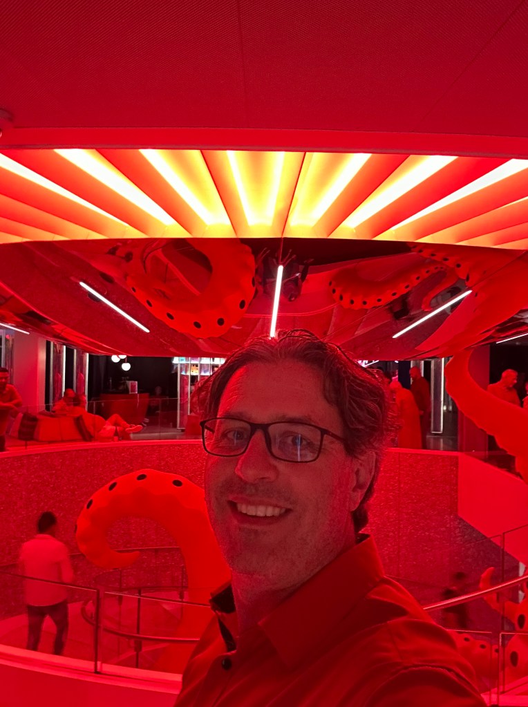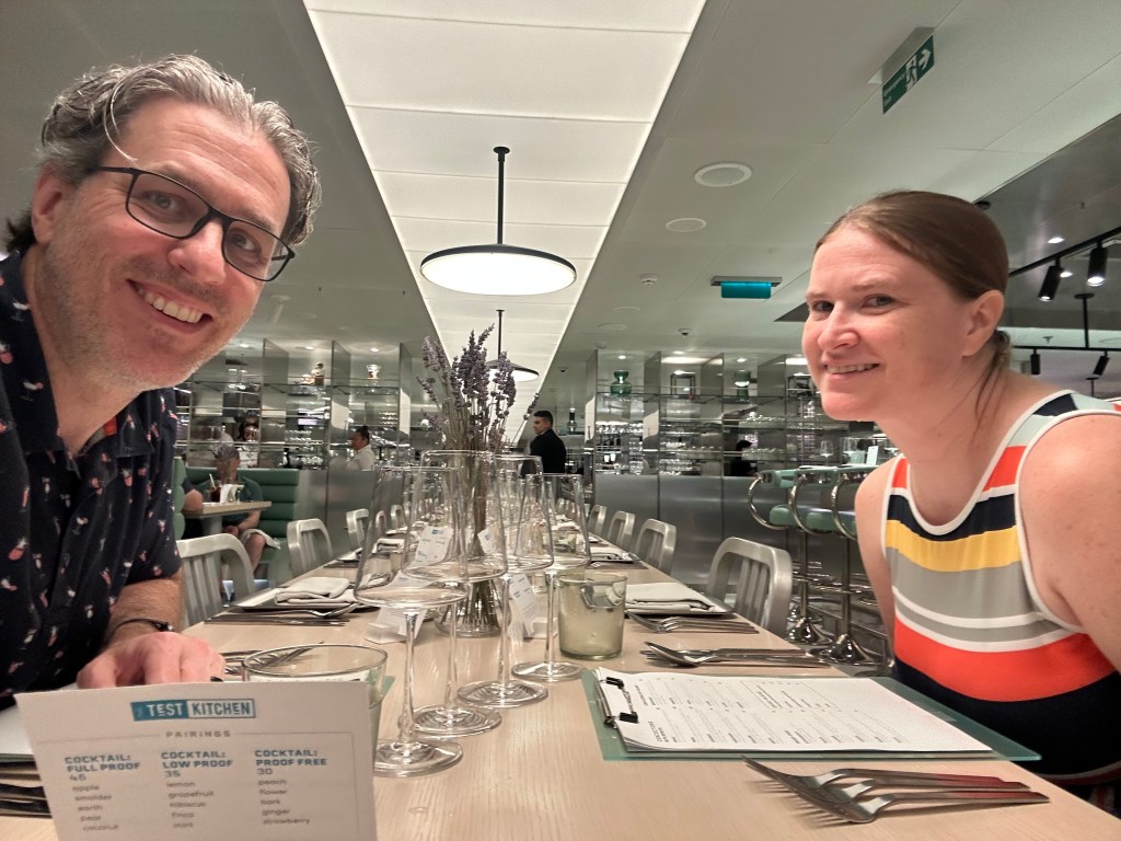 Back on board after St. Lucia, we cleaned up and made our way to Pink Agave, Virgin’s moody, modern Mexican restaurant that feels like it was designed for dramatic lighting and strong margaritas. We both ordered the ribeye, which I will confidently declare is the best steak you can get anywhere on the ship. Bold statement? Maybe. Accurate? Absolutely. Perfectly cooked, deeply flavorful, and served in a space that somehow feels both intimate and electric. It’s the kind of dinner where conversation slows down because you’re too busy appreciating what’s on your plate.