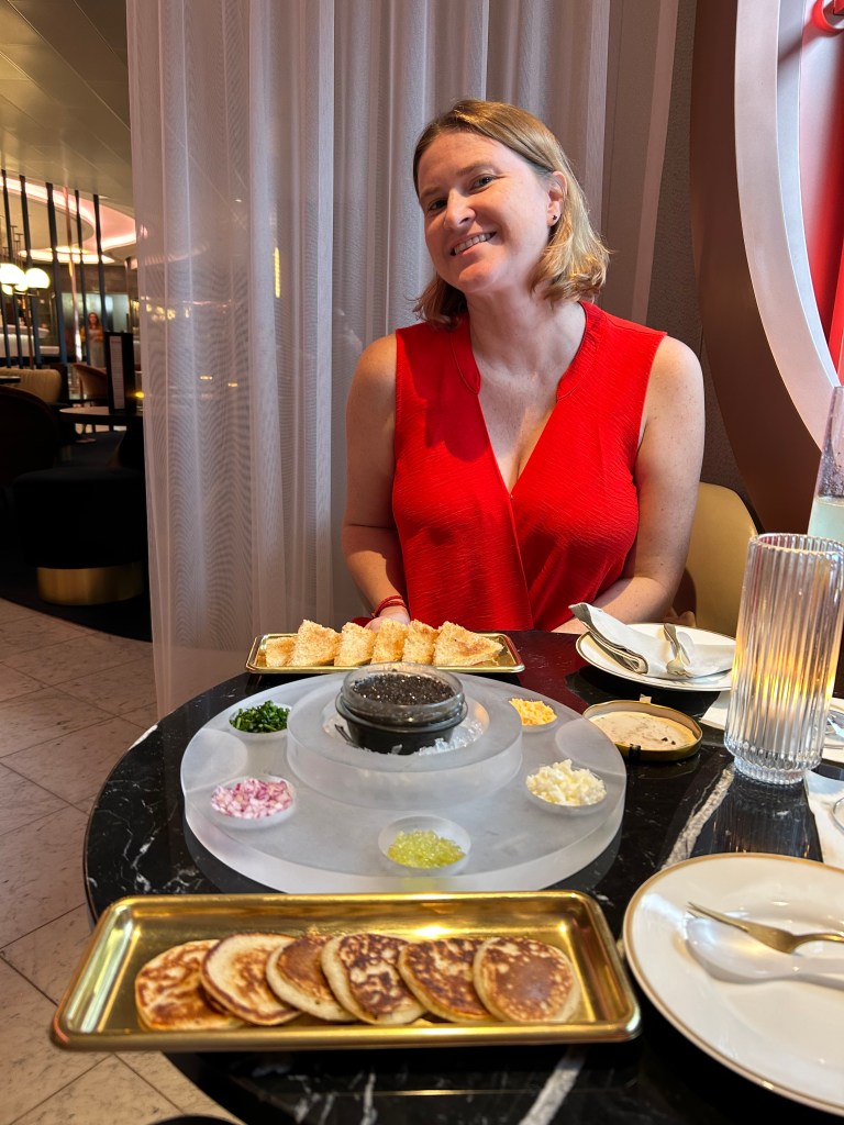As if the day hadn’t already proven itself, we returned to Sip Lounge before dinner for their caviar service, because when you’re floating in the middle of the ocean, why not lean in? Champagne, delicate bites, the quiet hum of pre-dinner energy building around us. It felt indulgent in the best way.